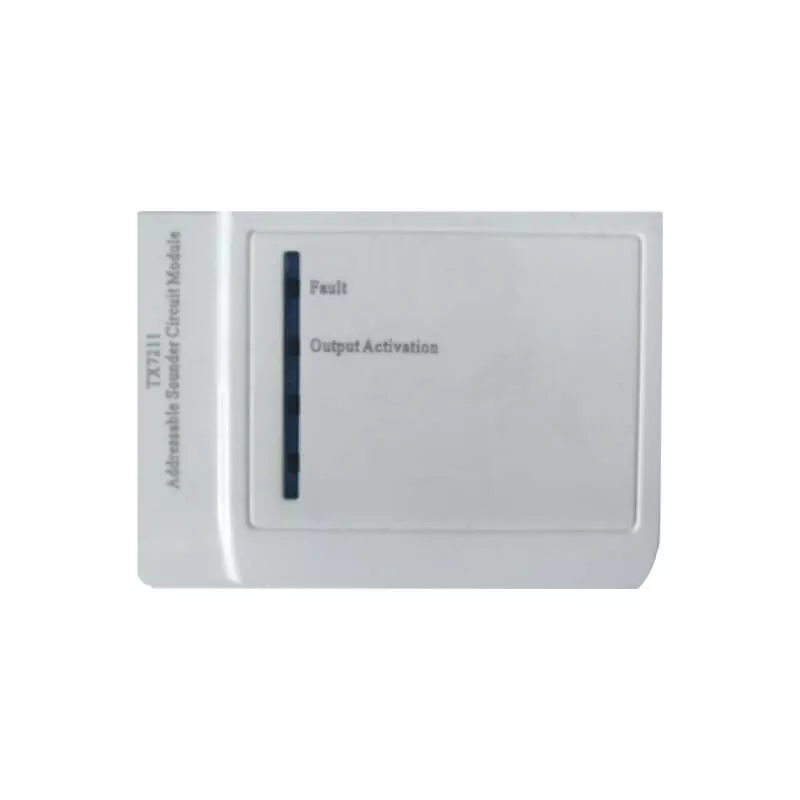 Addressable sounder interface module integrates conventional sounder or fire bell into an intelligent addressable loop. Upon receiving command from control panel, the module actuates the connected device and displays the specific address.