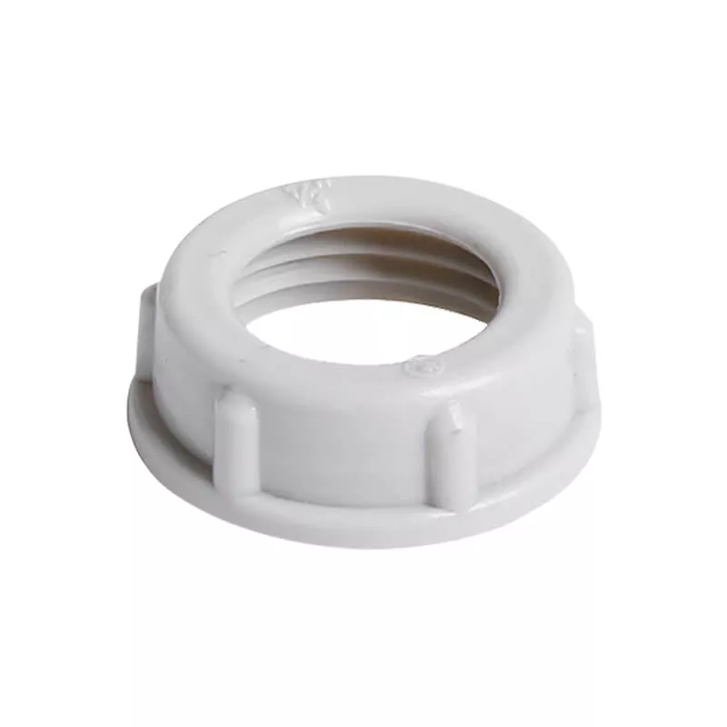 Plastic conduit bushing is threaded onto the ends of RMC or IMC where they enter an enclosure. It provides a smooth, rounded edge that safeguards wire insulation from abrasion by the conduit’s sharp cut end.
