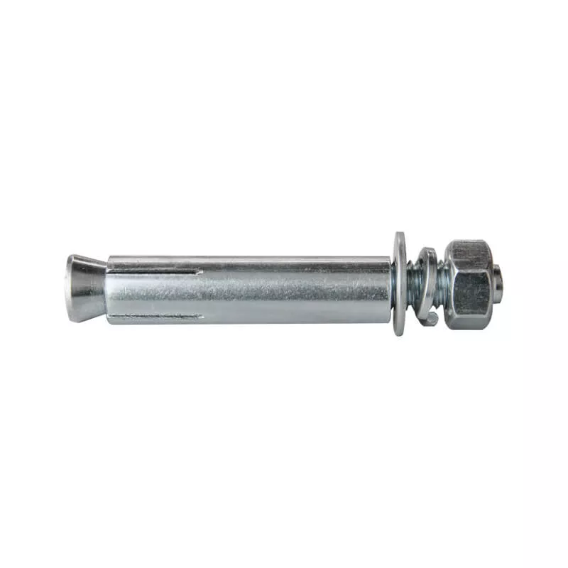 Reinforced sleeve expansion anchor is a mechanical anchor designed for medium to heavy-duty fastening in concrete and masonry. It features a threaded stud encased in a full-length reinforced sleeve and an expansion cone. Tightening the nut drives the cone, causing the sleeve to expand and lock securely against the hole wall, creating reliable holding power. It is engineered for structural attachment in environments without severe seismic demand.