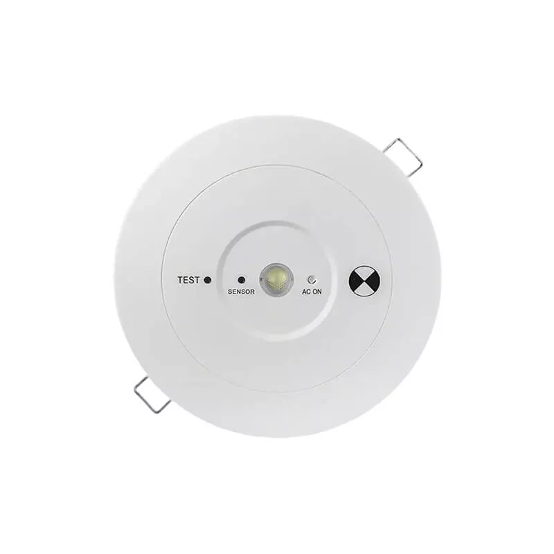 Self-contained non-maintained recessed emergency light for indoor use provides reliable illumination during power outages. It is mounted into an opening of a ceiling or wall to recess the main body, suitable for indoor use only. It automatically switches to emergency mode upon detecting a main power failure.