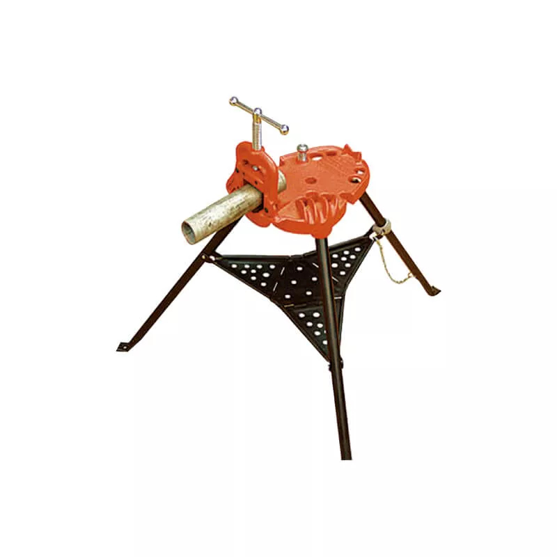Tripod yoke pipe vise is a heavy-duty, manually operated clamping tool which features integral legs for self-stand, and a tool tray to keep parts secure and within reach. It is used to securely grip metal or plastic pipes during plumbing and fabrication tasks such as cutting, threading, or assembly. Its superior jaw design prevents pipe slippage and excessive movement, while the robust construction ensures overall stability, operational safety, and precision.