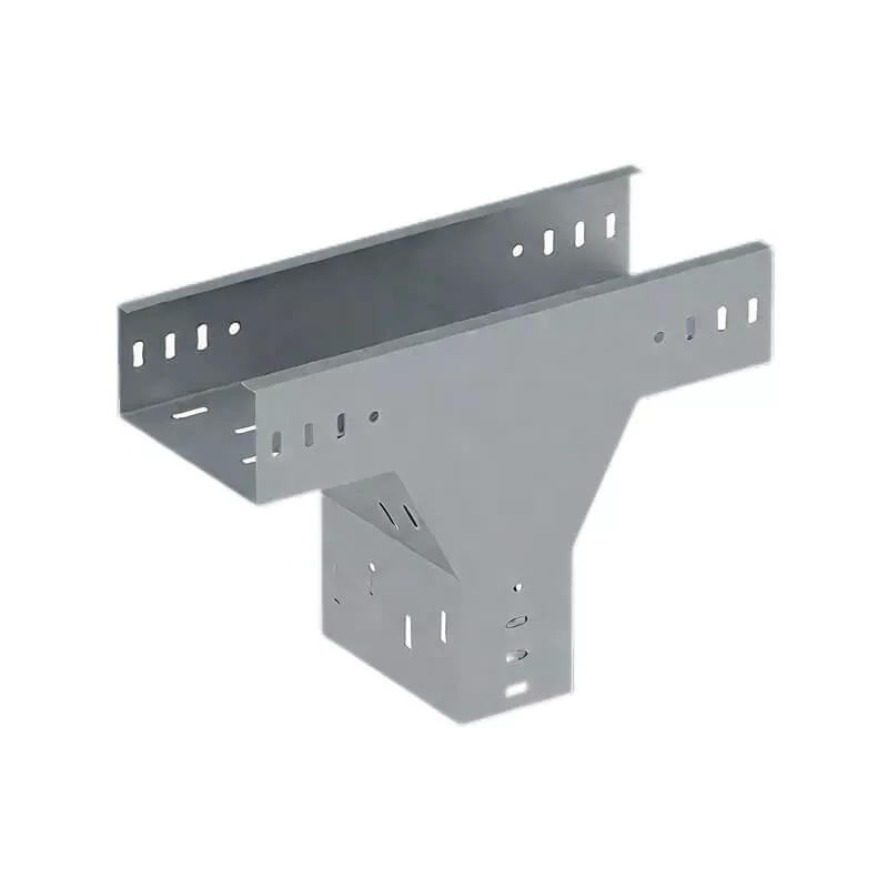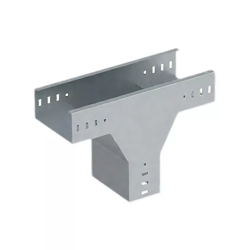 Vertical tee down connects three straight sections of channel cable tray, forming a smooth 90-degree branch in the outside vertical direction (dropping transition). This rigid fitting maintains the structural integrity and load capacity of the cable tray system while facilitating cable routing around corners, obstacles, or layout requirements. It ensures reliable support and protection for power, data, and control cables across commercial, industrial, and infrastructure applications.